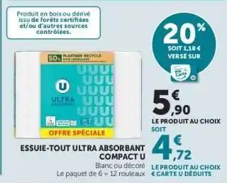 Actuellement en offre chez Hyper U : ESSUIE TOUT ULTRA ABSORBANT COMPACT U ✅ Valable du 14-04 au 26-04.