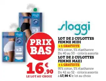 L'offre est disponible dans plusieurs magasins, vérifiez tous les produits pour obtenir le Lot de 2 culottes femme midi le moins cher. Si vous souhaitez savoir si l'article est en vente avec une plus grosse remise dans un autre magasin, consultez la catégorie 'Supermarché'. Ces offres pourraient aussi vous intéresser : Sloggi - lot de 2 culottes femme midi, Lot de 2 culottes femme maxi & 10 lot de 3 culottes maxibasic sloggi.