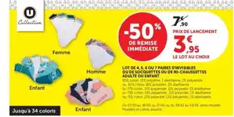 Actuellement en offre chez Hyper U : Lot de 4, 5, 6 ou 7 paires invisibles ou de socquettes ou de mi-chaussettes adulte ou enfant ✅ Valable du 24-03 au 6-04.