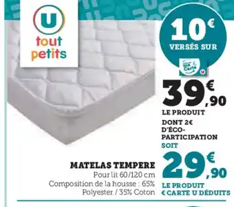 En plus de l'offre Matelas tempere, Hyper U propose une large gamme de produits. Consultez le Catalogue Hyper U hebdomadaire pour découvrir les meilleures offres et promotions. En plus de Matelas tempere, il y a aussi : Matelas tempere, Couette tempéré anti acariens & Matelas.