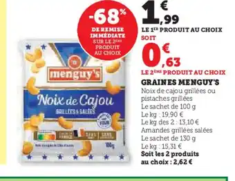 Actuellement, MENGUY'S Graines est en promotion chez Hyper U. Toutes les informations utiles comme le prix, les conditions et la durée de validité sont affichées sur cette page. Consultez également les promotions similaires pour MENGUY'S Graines, afin de faire le meilleur choix. La promo MENGUY'S Graines est valable du 27-01-2026 au 08-02-2026. Si elle est expirée, regardez les autres offres équivalentes. Vous pouvez aussi suivre cette catégorie de produit pour être alerté lorsqu’une nouvelle promotion MENGUY'S Graines apparaît chez Hyper U.Questions fréquemment posées au sujet de MENGUY'S Graines