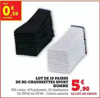 L'offre est disponible dans plusieurs magasins, vérifiez tous les produits pour obtenir le Mi-chaussettes sport homme le moins cher. Si vous souhaitez savoir si l'article est en vente avec une plus grosse remise dans un autre magasin, consultez la catégorie 'Supermarché'. Ces offres pourraient aussi vous intéresser : Lot de 10 paires de mi-chaussettes sport homme, Lot de 10 paires de mi-chaussettes sport homme & Prix mini - mi-chaussettes sport homme.