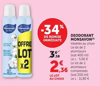 En plus de l'offre Monsavon déodorant au lait, Hyper U propose une large gamme de produits. Consultez le Catalogue Hyper U hebdomadaire pour découvrir les meilleures offres et promotions. En plus de Monsavon déodorant au lait, il y a aussi : Déodorant MONSAVON, Déodorant MONSAVON & Déodorant Atomiseur Lot de 2 MONSAVON.