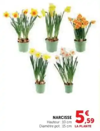 Cette Narcisse est maintenant disponible chez Hyper U. Découvrez toutes les promos en cours et profitez de réductions intéressantes. Commandez Narcisse en ligne via le site officiel de Hyper U ou achetez-la en magasin à un prix avantageux. Promocatalogues.fr réunit chaque jour les meilleures offres liées à Narcisse. Envie d’être informé en premier ? Activez l’alerte en cliquant sur la cloche pour recevoir une notification gratuite dès que ce produit revient en promotion.Questions fréquemment posées au sujet de Narcisse
