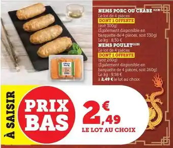 Nems porc bénéficie actuellement d'une réduction chez Hyper U. Vous trouverez ici toutes les infos utiles sur les prix, la durée de validité et les conditions de l’offre. Pensez à consulter aussi d'autres offres et promotions similaires pour Nems porc afin d’acheter toujours au bon prix. La promo Nems porc est valable du 10-02-2026 au 22-02-2026. Offre terminée ? Pas de souci. D'autres offres sur ces produits sont peut-être déjà disponibles. Vous pouvez suivre cette catégorie de produits pour rester informé en cas de nouvelle promotion Nems porc chez Hyper U. En comparant les offres, vous êtes sûr d’acheter au prix le plus bas possible.Questions fréquemment posées au sujet de Nems porc