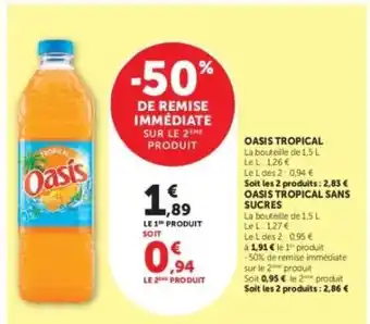 Actuellement, Oasis Tropical est en promotion chez Hyper U. Toutes les informations utiles comme le prix, les conditions et la durée de validité sont affichées sur cette page. Consultez également les promotions similaires pour Oasis Tropical, afin de faire le meilleur choix. La promo Oasis Tropical est valable du 21-04-2026 au 03-05-2026. Si elle est expirée, regardez les autres offres équivalentes. Vous pouvez aussi suivre cette catégorie de produit pour être alerté lorsqu’une nouvelle promotion Oasis Tropical apparaît chez Hyper U.Questions fréquemment posées au sujet de Oasis Tropical