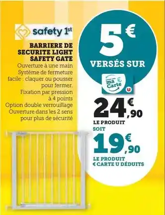En plus de l'offre Safety - barriere de securite light gate, Hyper U propose une large gamme de produits. Consultez le Catalogue Hyper U hebdomadaire pour découvrir les meilleures offres et promotions. En plus de Safety - barriere de securite light gate, il y a aussi : Barriere de securite light safety gate, Barriere de securite light security light safety gate & Safety 1st Barrière de sécurité.