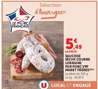 Saucisse sèche courbe Lorraine pur porc VPF Manet Frères offres et promotions en ligne chez Hyper U