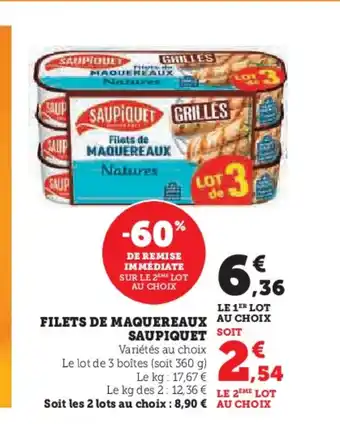 Le prix de l'offre SAUPIQUET Filets de maquereaux se trouve également en haut de la page, ainsi que la date à laquelle l'offre est disponible. Vous pouvez également vérifier les prix dans le Catalogue Hyper U actuel ou sur le site Internet de Hyper U. Les offres vous permettent d'acheter les produits Hyper U au prix le plus bas.