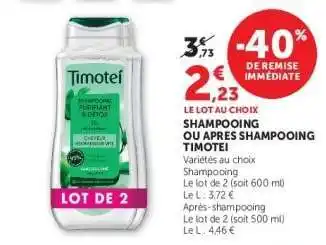 En plus de l'offre Shampooing ou Après Shampooing Timotei, Hyper U propose une large gamme de produits. Consultez le Catalogue Hyper U hebdomadaire pour découvrir les meilleures offres et promotions. En plus de Shampooing ou Après Shampooing Timotei, il y a aussi : Shampooing ou Après Shampooing Timotei, TIMOTEI Shampooing ou apres shampooing & Timotei shampooing ou apres shampooing.