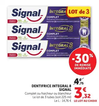 En plus de l'offre Signal dentifrice integral 8, Hyper U propose une large gamme de produits. Consultez le Catalogue Hyper U hebdomadaire pour découvrir les meilleures offres et promotions. En plus de Signal dentifrice integral 8, il y a aussi : SIGNAL Dentifrice integral 8, Signal - dentifrice intégral 8 & Signal dentifrice intégral 8 complet.