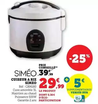 Actuellement en offre chez Hyper U : Simeo - cuiseur a riz crm180 ✅ Valable du 3-02 au 15-02.