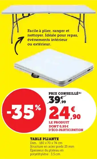 Le prix de l'offre Table pliante se trouve également en haut de la page, ainsi que la date à laquelle l'offre est disponible. Vous pouvez également vérifier les prix dans le Catalogue Hyper U actuel ou sur le site Internet de Hyper U. Les offres vous permettent d'acheter les produits Hyper U au prix le plus bas.