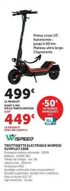 Actuellement en offre chez Hyper U : TROTTINETTE ELECTRIQUE WISPEED SUVpilot 1500R ✅ Valable du 24-03 au 19-04.