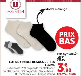 Actuellement en offre chez Hyper U : U essentiel lot de 3 paires de socquettes femme ✅ Valable du 8-04 au 19-04.