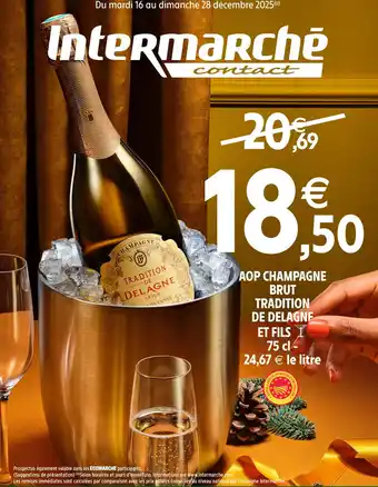 Actuellement en offre chez Intermarché Contact : Aop champagne brut tradition de delagne et fils ✅ Valable du 16-12 au 28-12.