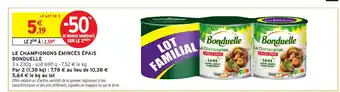 Actuellement, BONDUELLE Le champignons émincés épais est en promotion chez Intermarché Contact. Toutes les informations utiles comme le prix, les conditions et la durée de validité sont affichées sur cette page. Consultez également les promotions similaires pour BONDUELLE Le champignons émincés épais, afin de faire le meilleur choix. La promo BONDUELLE Le champignons émincés épais est valable du 21-04-2026 au 03-05-2026. Si elle est expirée, regardez les autres offres équivalentes. Vous pouvez aussi suivre cette catégorie de produit pour être alerté lorsqu’une nouvelle promotion BONDUELLE Le champignons émincés épais apparaît chez Intermarché Contact.Questions fréquemment posées au sujet de BONDUELLE Le champignons émincés épais