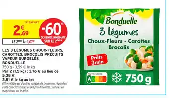 Offre BONDUELLE Les 3 légumes choux-fleurs, carottes, brocolis précuits vapeur surgelés chez Intermarché Contact