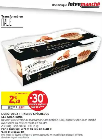 Le prix de l'offre L'onctueux tiramisu spéculoos les créations se trouve également en haut de la page, ainsi que la date à laquelle l'offre est disponible. Vous pouvez également vérifier les prix dans le Catalogue Intermarché Contact actuel ou sur le site Internet de Intermarché Contact. Les offres vous permettent d'acheter les produits Intermarché Contact au prix le plus bas.