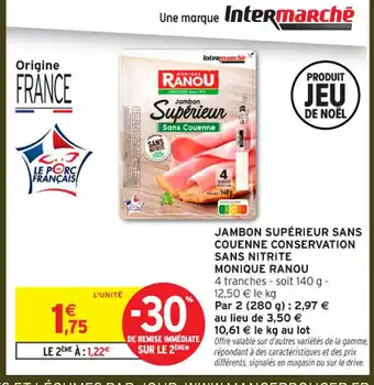 Actuellement en offre chez Intermarché Contact : MONIQUE RANOU Jambon supérieur sans couenne conservation sans nitrite ✅ Valable du 16-12 au 28-12.