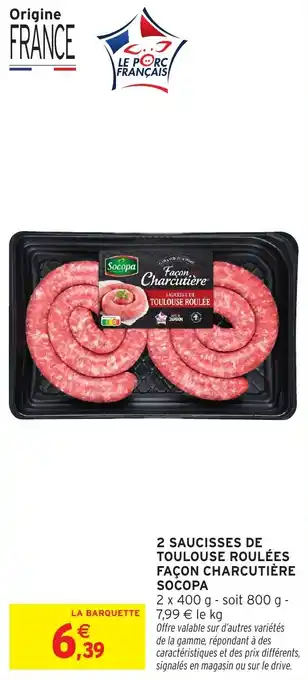 Le prix de l'offre 2 saucisses de toulouse roulées façon charcutière socopa se trouve également en haut de la page, ainsi que la date à laquelle l'offre est disponible. Vous pouvez également vérifier les prix dans le Catalogue Intermarché Express actuel ou sur le site Internet de Intermarché Express. Les offres vous permettent d'acheter les produits Intermarché Express au prix le plus bas.