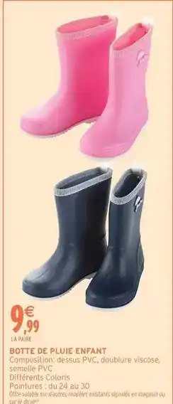 L'offre est disponible dans plusieurs magasins, vérifiez tous les produits pour obtenir le Boîte de pluie enfant le moins cher. Si vous souhaitez savoir si l'article est en vente avec une plus grosse remise dans un autre magasin, consultez la catégorie 'Supermarché'. Ces offres pourraient aussi vous intéresser : Bottes de pluie enfant, Bottes de pluie enfant & Botte de pluie enfant.