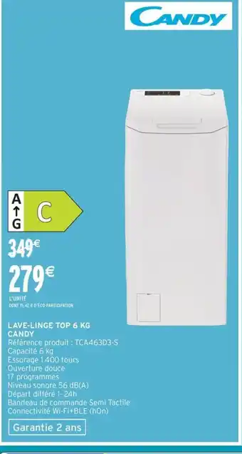 L'offre est disponible dans plusieurs magasins, vérifiez tous les produits pour obtenir le CANDY Lave-linge top le moins cher. Si vous souhaitez savoir si l'article est en vente avec une plus grosse remise dans un autre magasin, consultez la catégorie 'Supermarché'. Ces offres pourraient aussi vous intéresser : CANDY Lave-linge top, Candy lave-linge top 6 kg & Lave-linge Top 6 kg Candy.