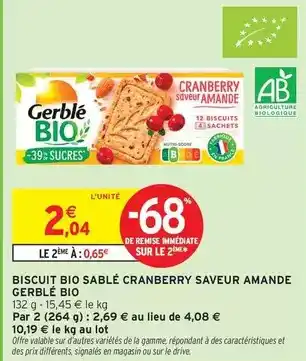 Actuellement en offre chez Intermarché Express : Gerblé - biscuit bio sablé cranberry saveur amande bio ✅ Valable du 27-01 au 8-02.