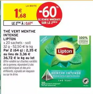 Actuellement en offre chez Intermarché Express : Lipton - thé vert menthe intense ✅ Valable du 13-03 au 22-03.