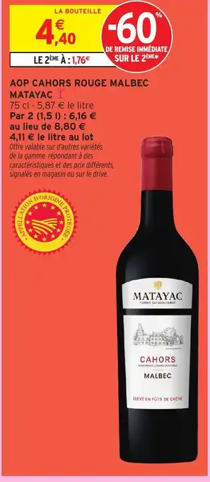 En plus de l'offre MATAYAC Aop cahors rouge malbec, Intermarché Express propose une large gamme de produits. Consultez le Catalogue Intermarché Express hebdomadaire pour découvrir les meilleures offres et promotions. En plus de MATAYAC Aop cahors rouge malbec, il y a aussi : MATAYAC Aop cahors rouge malbec, AOP CAHORS ROUGE MALBEC & CAHORS AOP 2021.