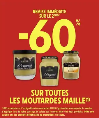 L'offre est disponible dans plusieurs magasins, vérifiez tous les produits pour obtenir le Sur toutes les moutardes maille le moins cher. Si vous souhaitez savoir si l'article est en vente avec une plus grosse remise dans un autre magasin, consultez la catégorie 'Supermarché'. Ces offres pourraient aussi vous intéresser : MAILLE Sur toutes les moutardes, MAILLE Sur toutes les moutardes & MAYONNAISE MAILLE.