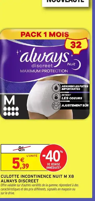 Offre ALWAYS DISCREET Culotte incontinence nuit m x8 chez Intermarché Hyper