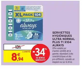 Actuellement en offre chez Intermarché Hyper : ALWAYS Serviettes hygiéniques ultra normal plus t1 x104 ✅ Valable du 17-02 au 1-03.
