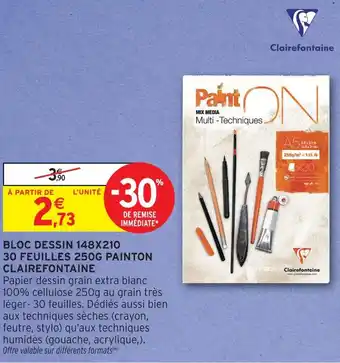 Actuellement en offre chez Intermarché Hyper : Clairefontaine bloc dessin 148x210 30 feuilles 250g painton ✅ Valable du 14-04 au 26-04.