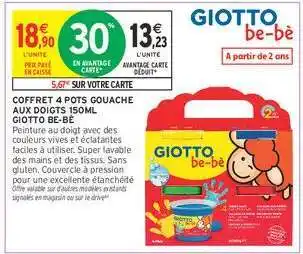 Actuellement en offre chez Intermarché Hyper : COFFRET 4 POTS GOUACHE AUX DOIGTS 150ML GIOTTO BE-BÈ ✅ Valable du 3-02 au 15-02.