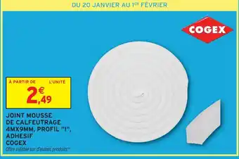 Actuellement en offre chez Intermarché Hyper : Cogex joint mousse de calfeutrage 4mx9mm, profil 'i', adhésif ✅ Valable du 20-01 au 1-02.