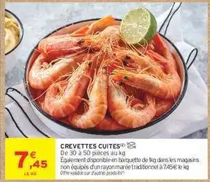 Quand CREVETTES CUITES sera-t-elle en promotion ? Ou encore : "Est-ce que CREVETTES CUITES sera en promotion la semaine prochaine ?" C’est une question fréquente. Beaucoup de consommateurs établissent leur liste de courses à l’avance. Pour cette raison, nous mettons en ligne les informations sur les promos à venir dès qu’elles sont connues. Cela vous permet de planifier vos achats et de faire de bonnes affaires. Consultez régulièrement notre site pour savoir si une nouvelle promo sur CREVETTES CUITES arrive bientôt chez Intermarché Hyper.Questions fréquemment posées au sujet de CREVETTES CUITES