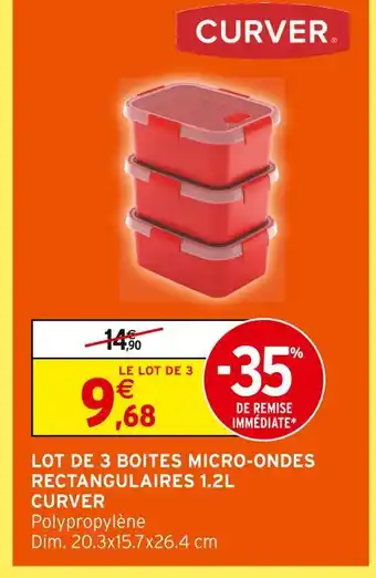 Actuellement en offre chez Intermarché Hyper : Curver lot de 3 boîtes micro-ondes rectangulaires 1.2l ✅ Valable du 13-01 au 25-01.
