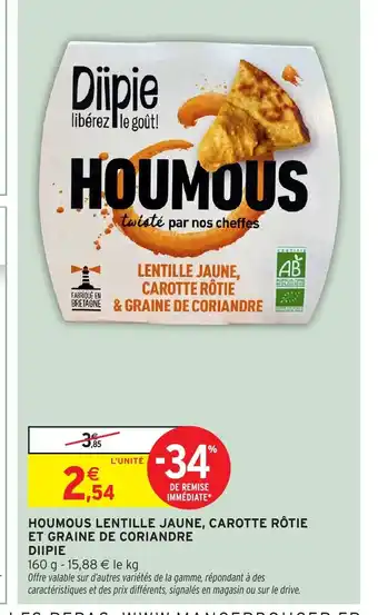 Offre DIIPIE Houmous lentille jaune, carotte rôtie et graine de coriandre chez Intermarché Hyper