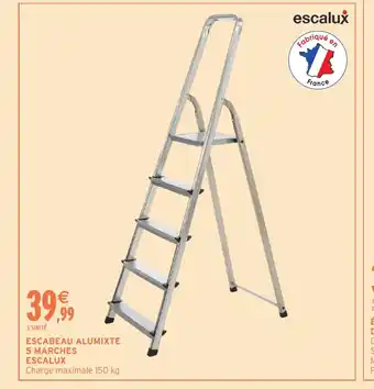 En plus de l'offre ESCALUX Escabeau alumixte 5 marches, Intermarché Hyper propose une large gamme de produits. Consultez le Catalogue Intermarché Hyper hebdomadaire pour découvrir les meilleures offres et promotions. En plus de ESCALUX Escabeau alumixte 5 marches, il y a aussi : Escalux - escabeau alumixte 5 marches, ESCABEAU ALUMIXTE 5 MARCHES ESCALUX & Escabeau pliable 5 marches antiderapant.