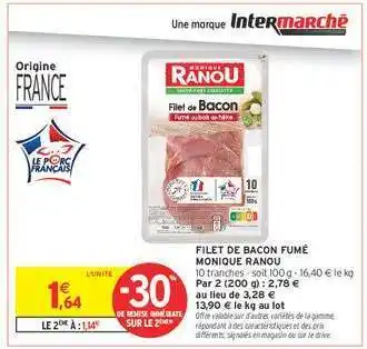 Actuellement en offre chez Intermarché Hyper : FILET DE BACON FUMÉ MONIQUE RANOU ✅ Valable du 3-02 au 15-02.