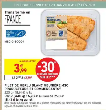 Actuellement en offre chez Intermarché Hyper : Filet de merlu blanc meunière msc producteurs et commercants ✅ Valable du 20-01 au 1-02.