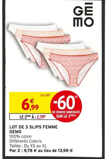 Actuellement en offre chez Intermarché Hyper : Gemo lot de 3 slips femme ✅ Valable du 13-01 au 25-01.