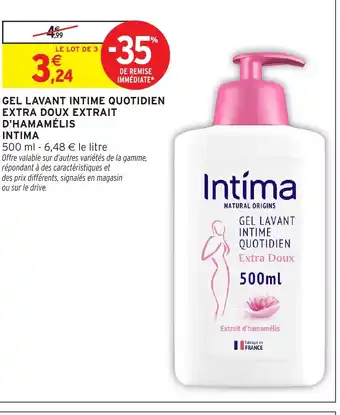 Actuellement en offre chez Intermarché Hyper : INTIMA Gel lavant intime quotidien extra doux extrait d'hamamélis ✅ Valable du 24-02 au 8-03.