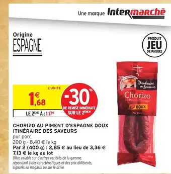 Actuellement en offre chez Intermarché Hyper : ITINÉRAIRE DES SAVEURS Chorizo au piment d'espagne doux ✅ Valable du 17-03 au 29-03.