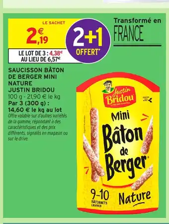Actuellement en offre chez Intermarché Hyper : JUSTIN BRIDOU Saucisson bâton de berger mini nature ✅ Valable du 17-03 au 29-03.