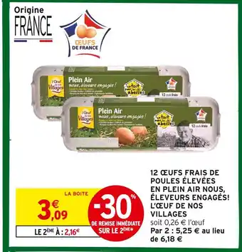 Actuellement en offre chez Intermarché Hyper : L'oeuf de nos villages 12 œufs frais de poules élevées en plein air nous, éleveurs engagés! ✅ Valable du 13-01 au 25-01.
