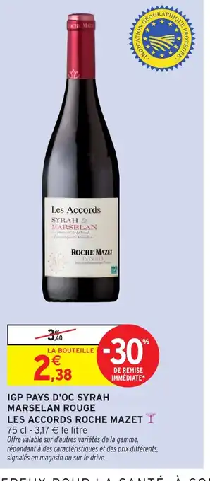 Actuellement en offre chez Intermarché Hyper : LES ACCORDS ROCHE MAZET Igp pays d'oc syrah marselan rouge ✅ Valable du 17-02 au 1-03.