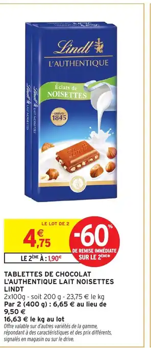 Actuellement en offre chez Intermarché Hyper : LINDT Tablettes de chocolat l'authentique lait noisettes ✅ Valable du 10-02 au 22-02.