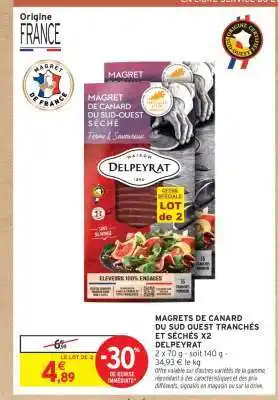 Actuellement en offre chez Intermarché Hyper : MAGRETS DE CANARD DU SUD OUEST TRANCHÉS ET SÉCHÉS X2 DELPEYRAT ✅ Valable du 27-01 au 8-02.